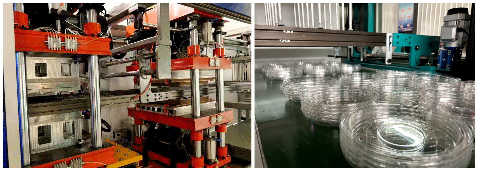 7. Forming, cutting unit, open mold, mold clamping servo motor control, automatic counting output.